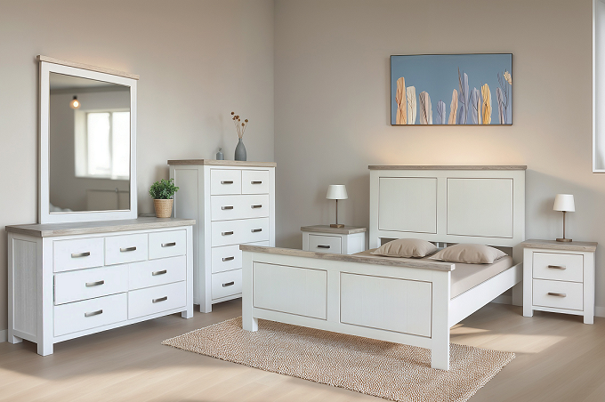 Ashland comprises Queen bed frame, 2 drawer bedside table, 5 drawer tallboy, 6 drawer chest, 7 drawer dressing table and mirror, Dining Table and Chair, 1.8m Buffet Table, 1.32m buffet table, 0.9m buffet table, 2 Door TV Unit, 2 Drawers Coffee Table, 1 drawer lamp table, Hall Table,Display Cabinet, Wine Cabinet,